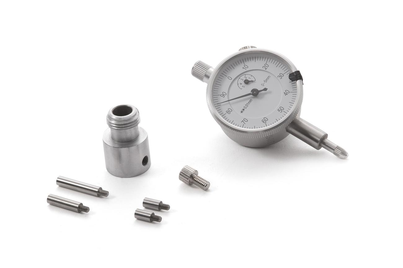 - Kit includes a dial indicator with extensions and a 14 mm spark plug thread adapter