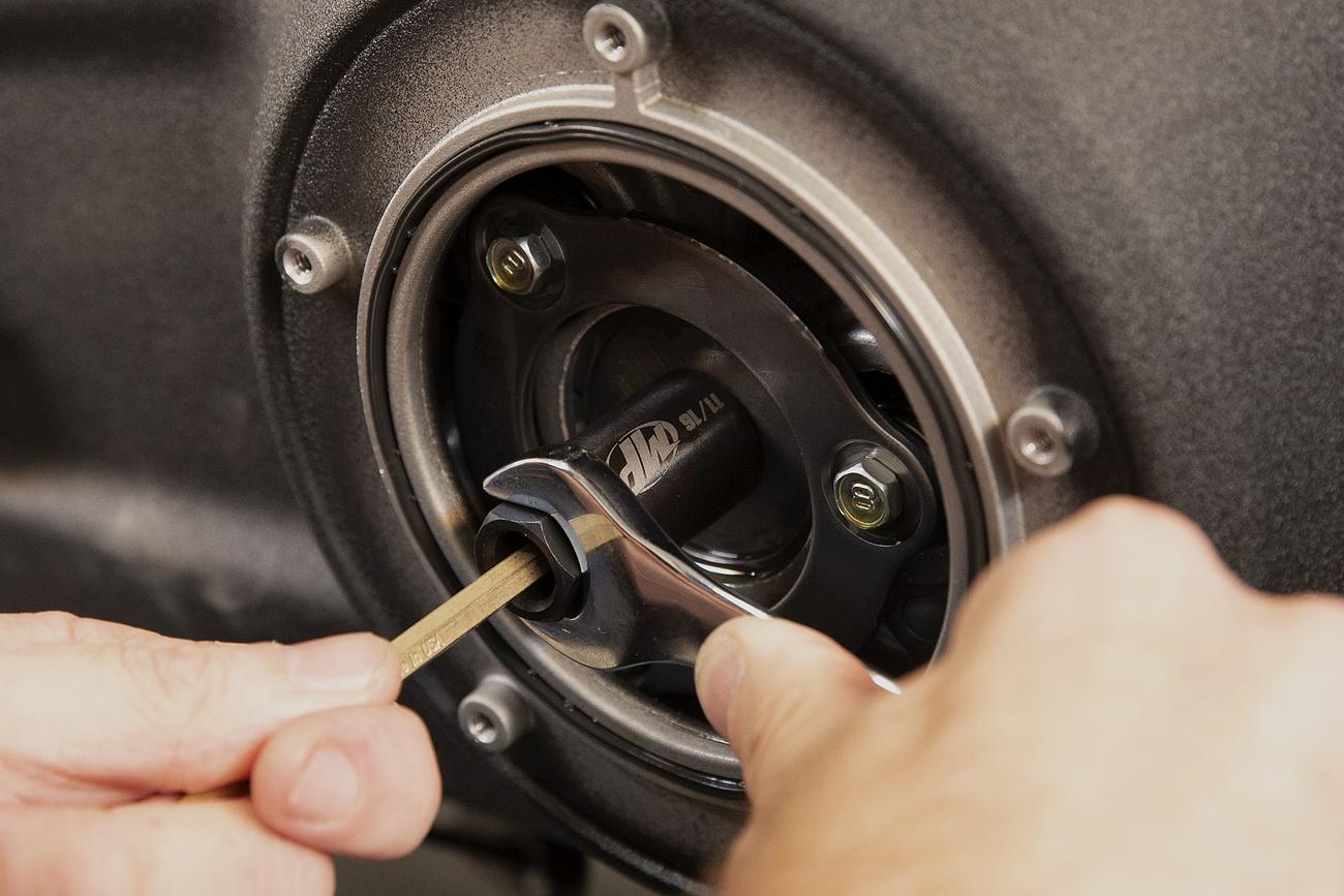 - Through hole allows access with hex wrench to hold clutch adjuster screw while simultaneously tightening the adjuster lock-nut