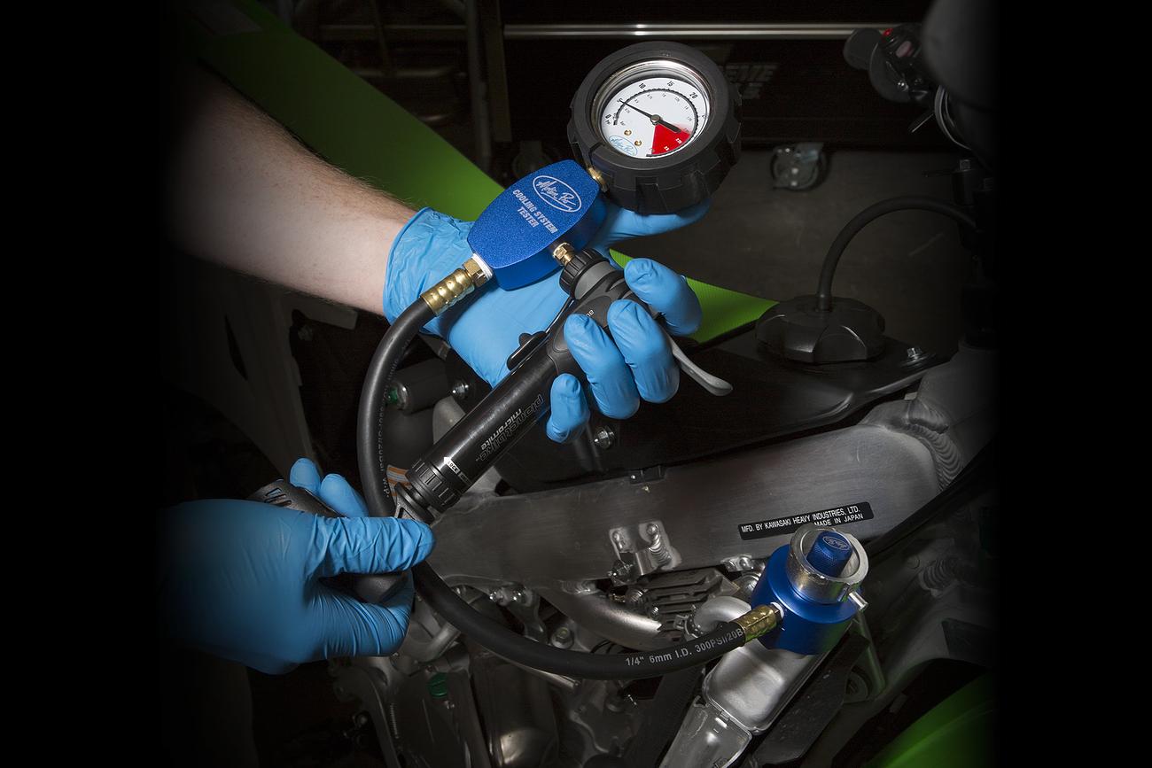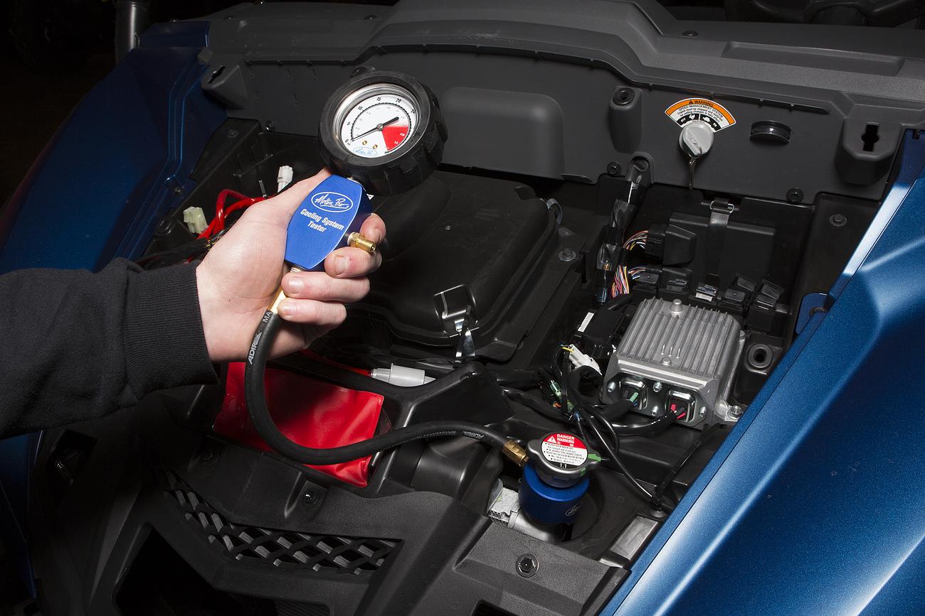 - Pressurize motorcycle or ATV cooling system to check for leaks